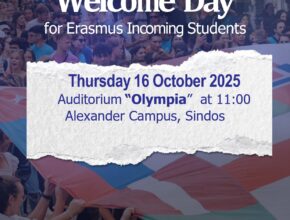 Την Πέμπτη 16 Οκτωβρίου 2025, στις 11:00 π.μ., θα πραγματοποιηθεί τελετή καλωσορίσματος για τους φοιτητές Erasmus του ΔΙΠΑΕ (Χειμερινό Εξάμηνο 2025–2026) στο Αμφιθέατρο «ΟΛΥΜΠΙΑ» (Αλεξάνδρεια Πανεπιστημιούπολη). Για τους φοιτητές Erasmus …